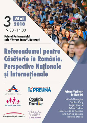 Pe 3 mai 2018, între orele 9:30 și 14:00, în Sala „Avram Iancu” din Parlamentul României va avea loc Conferința internațională „Referendumul pentru căsătorie. Perspective naționale și internaționale”.
