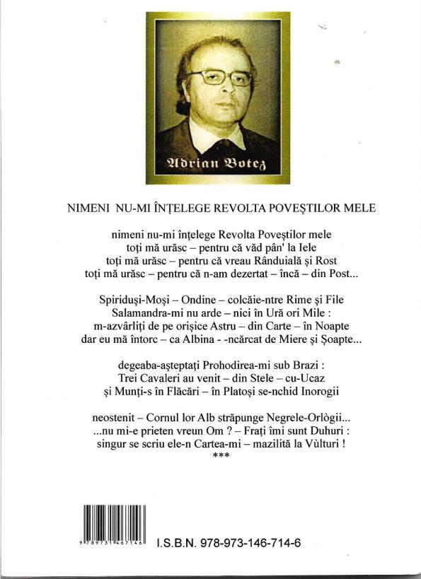 Poemele lui Adrian Botez au încrustate în piatra lor zbuciumul lumii. Versurile se frâng, se caută unele pe altele, oferă portaluri de idei, spre o lume spirituală. Există un ritm specific, modelat de gândurile materializate în versuri. Versurile sunt străbătute de semne, poetul le scrie cu literă mare pentru a atrage atenția asupra simbolurilor ascunse. Este un clasic, care forțează limitele, ferindu-se de capcanele unei modernități superficiale. Prezentul are înscris, în mesaj, trecutul și viitorul, speranțele și țipătul. Folclorul are un loc aparte, sunt preluate temele majore ale sufletului românesc. Versurile sunt marcate de un misticism construit pe idei solide și fragile, în același timp. Cititorul este solicitat și inițiat simultan. Sunt poeme pentru cei care cunosc sensul în istorie. Limbajul este dens, ideile academice se întâlnesc cu zicerile de fiecare zi. Viziunea de Sus se leagă de necesitățile obișnuite. Spasmul cosmic se desfășoară peste spasmul omului afectat de neputințe. Există o democrație a cuvintelor, în scrierile lui Adrian Botez, o generozitate a revoltei.