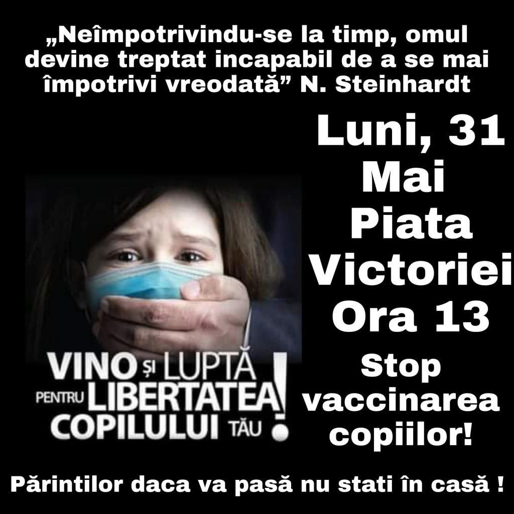 Astăzi, 31 mai 2021, începând cu ora 13.00, organizația civică Legitimă Apărare protestează în Piața Victoriei față de decizia iresponsabilă a autorităților de a începe o campanie de vaccinare a copiilor cu seruri experimentale. Părinții și bucureștenii sunt chemați să-și apere copii măcar prin drepturile încă libere de exprimare și întrunire, după cum se vede în anunțul video al organizației, transmis de Luis Bratu.