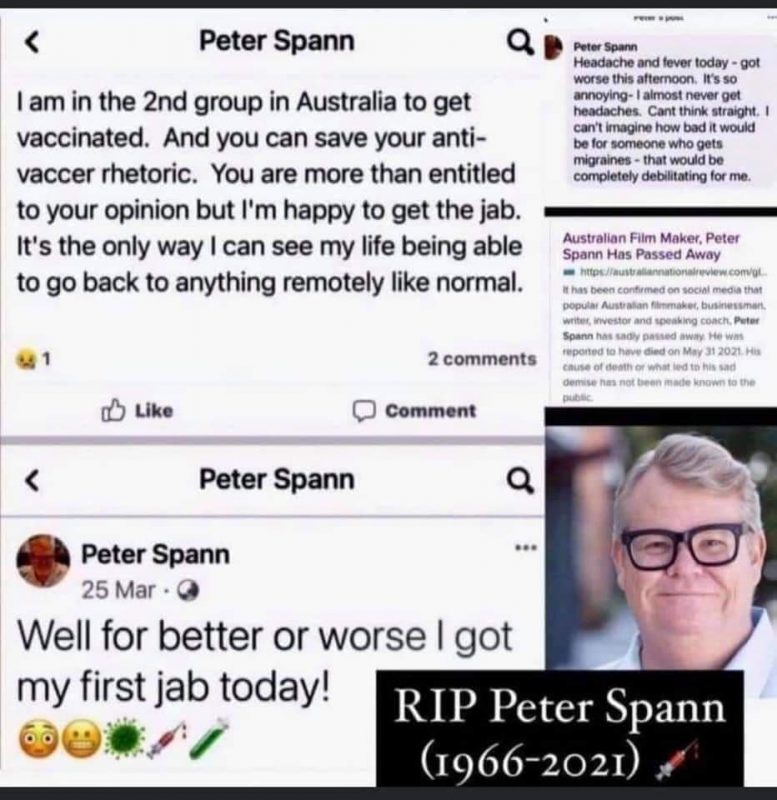 Într-o postare pe rețelele de socializare, Peter Spann, regizor australian, anunță că se vaccinează pentru că în opinia lui este singura metodă prin care ne vom întoarce la normalitate. Amăgirea lui n-a durat, în urma vaccinării a mai făcut o postare în care descria efecte adverse dureroase. Apoi a decedat (la vârsta de 55 de ani).