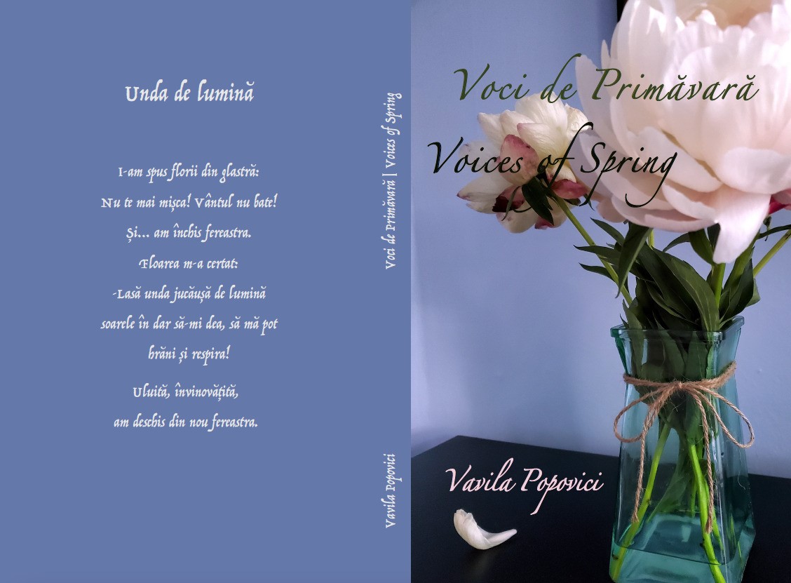 În „VOCI DE PRIMĂVARĂ” apar caiși, păsări, îngeri, dorințe, fluturi, grădinile copilăriei, maci, petunii, apare Expo-Parcul, în proximitatea căruia poeta a locuit zeci de ani, tresare creanga de salcie, miros teii, luminează cărți, în odăi frăgezite de liniște, tace pământul în noaptea Învierii Domnului. Toate acestea sunt, e corect să recunoaștem, ca apa de fântână în dogoarea și în frica de-afară. Pentru că, oriunde întorci capul, te întâmpină zgomot de sumbre prefaceri, ca zgomotul de război, și te izbești de întunecimi sufletești. Or, peisajele din altă viață, din alt timp, recreate de volumul doamnei Vavila Popovici, reușesc să ridice o barieră, chiar dacă fragilă, între acum și mâine, între ce încă mai este și ce ar putea fi.