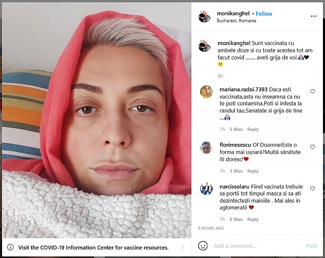 „Sunt vaccinata cu ambele doze si cu toate acestea tot am facut covid …….. aveti grija de voi”, e mesajul postat de Monica Anghel pe conturile sale de pe rețelele sociale invadate apoi de mii de comentarii.