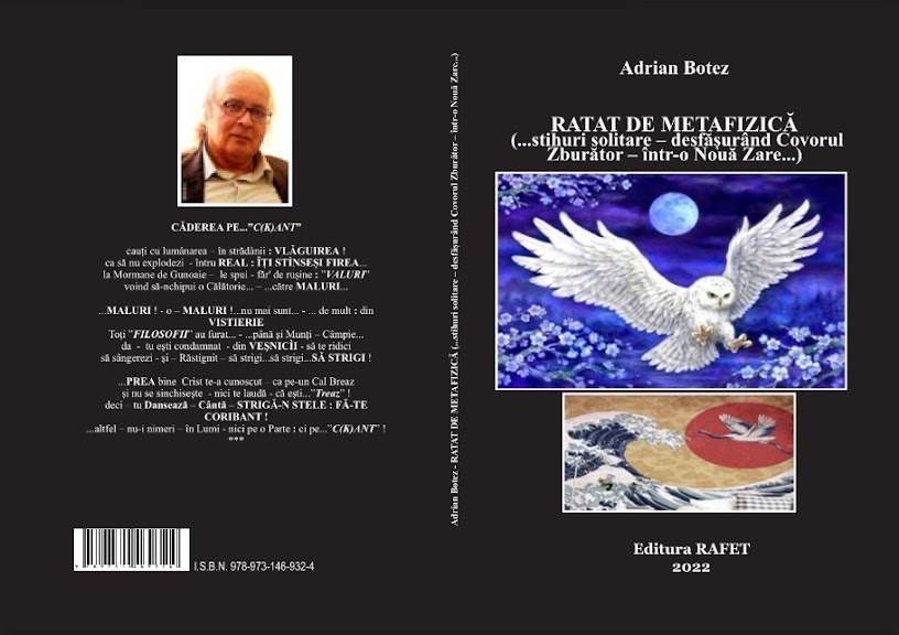 Adrian Botez scrie. Mă bucur enorm să spun asta, azi, după ce am apucat în mână ultima (dar nu cea din urmă) carte de poezie a scriitorului. Care a revenit, la propriu, din morți, după cum îmi mărturisea, mai deunăzi. Adrian Botez scrie, dar nu scrie oricum. Cartea sa de poezie ”Ratat(sic!) de metafizică”, precedată de un ”Prolog” ușor explicativ, alcătuită din trei părți, Partea I – ”Ratat de metafizică”, partea a-II-a, ”Rubaiyatele unor zori nemaiîncercați” și, respectiv, ”Epilog”, nu este ușor de citit, mai ales pentru un neavizat, cum mă aflu. Pentru că Adrian Botez scrie cu patimă, scrie scrâșnit, aproape ostil, uneori batjocoritor, despre un subiect care a preocupat omenirea, încă din vremuri de mult apuse. Titlul cărții pare să fie și el batjocoritor, peiorativ. Prin simpla eliminare a literei ”T” din cuvântul ”tratat”, autorul obține un joc de cuvinte cu dublu sens: te-ai aștepta să fie vorba despre metafizică în înțelesul ei clasic, obișnuit, aristotelic, ontologic. Pornind , bineînțeles, de la sensul ”comun” al cuvântului, acela de studiere filosofică a realității (cf. Meta (gr.) – ”după”, ”conform cu” sau ”despre” și, respectiv, ”phisika” – ”realitate”, ”existență”, ”concret”) autorul ajunge la eșecul omului de a cunoaște realitatea, la ”rateul” demersului filosofic de a cunoaște ceea ce, el însuși, prin propriile forțe – NU POATE. Așa am înțeles eu, cu puținele mele cunoștințe, dar, mai ales, în urma lecturii poemelor, de o largă diversitate, formă și respirație, cuprinse în carte. Las a mai pomeni că, la așa-zisa confuzie – voită, intenționată de autor – contribuie, din plin, și celălalt sens, modern, al cuvântului în cauză. Dacă filosofii veacurilor recente au găsit de cuviință să recurgă la înțelesul ”pe dos” al cuvântului ”metafizică”, luând în considerare celălalt înțeles al particulei grecești ”meta”, acela de ”peste” sau ”dincolo de”, și obținând astfel un cuvânt al cărui înțeles profan este exact contrar celui inițial, respectiv dincolo de realitate sau experiență, atunci înțelegem un pic mai bine, cred eu, intenția peiorativă, sau în răspăr, a titlului cărții. Oricum ar fi, autorul are, față de lumea în care trăim (ba, chiar și despre cea în care, după toate datele evangheliilor, vom ajunge după moarte), o atitudine crâncen critică, cu accente adesea batjocoritoare. Dacă, în ”Prolog”- poezia care deschide volumul –, lucrurile par cuminți, chiar cuviincios așezate :
